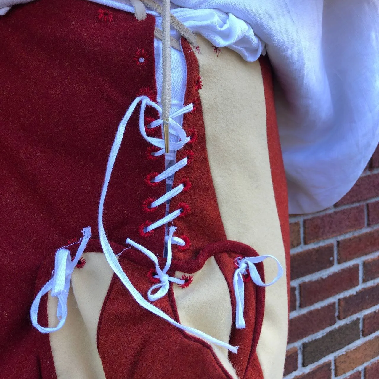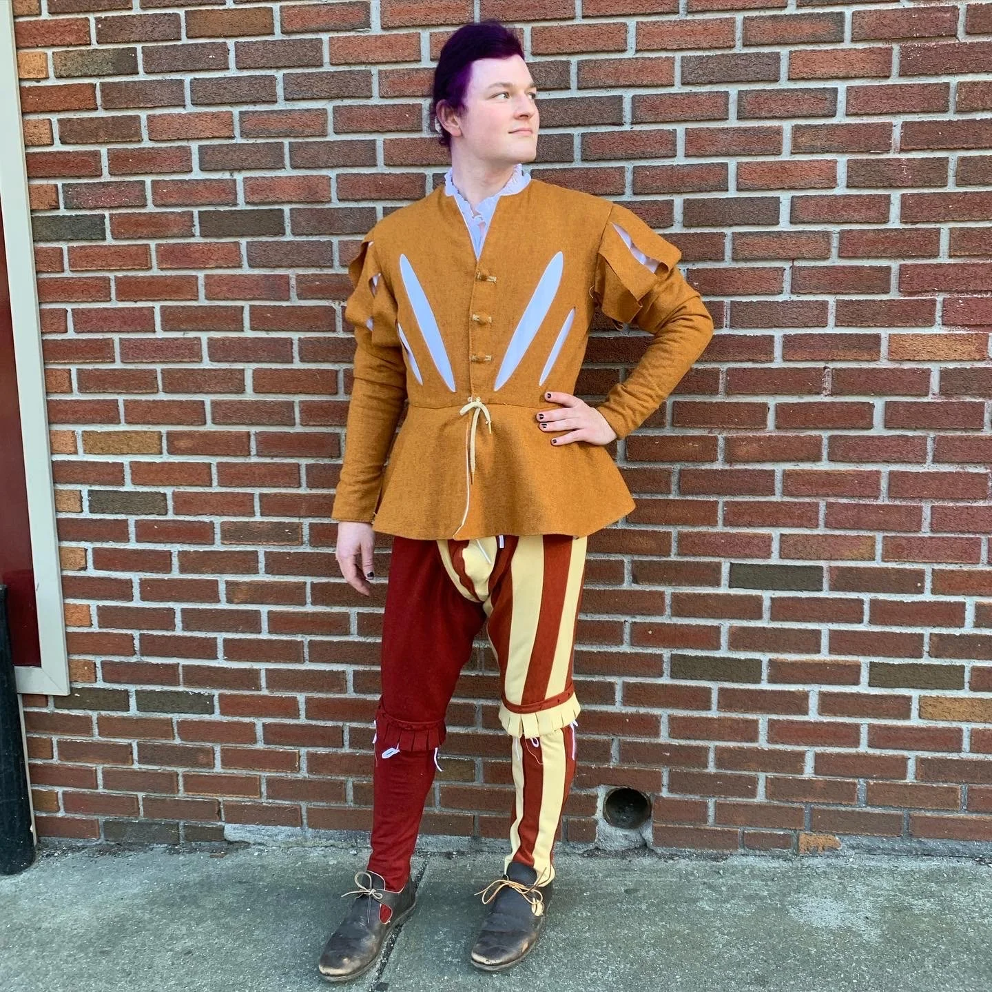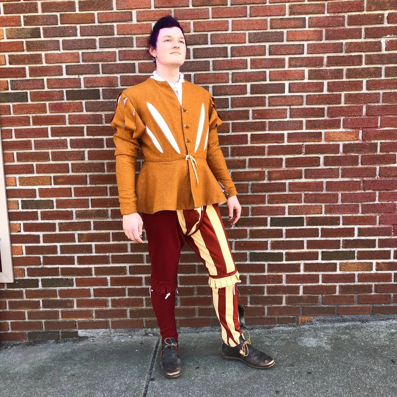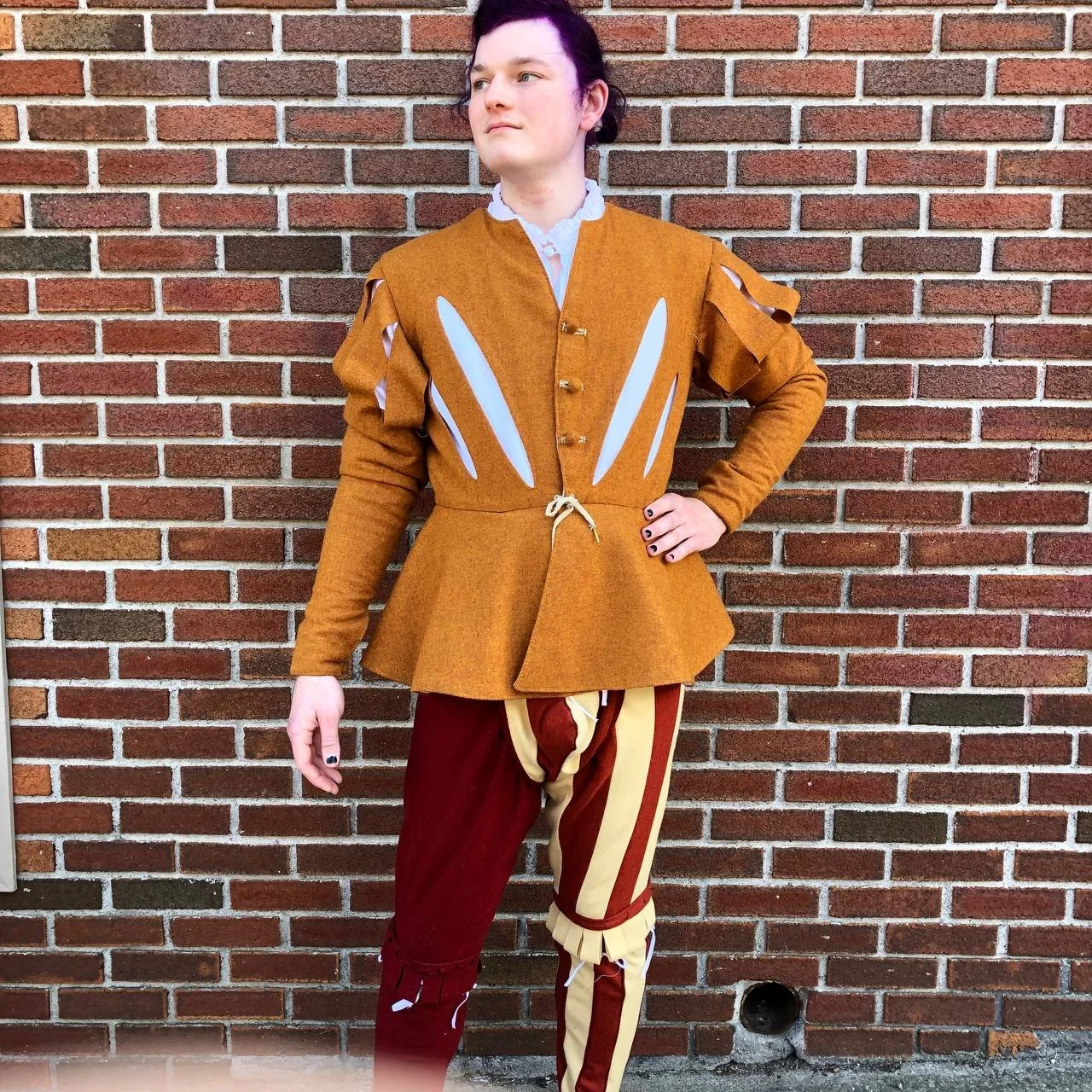 The suit is a fascinating mix of older and newer 16th century fashions. Tight hosen paired with skirted wams illustrates the changing silhouette of the period.