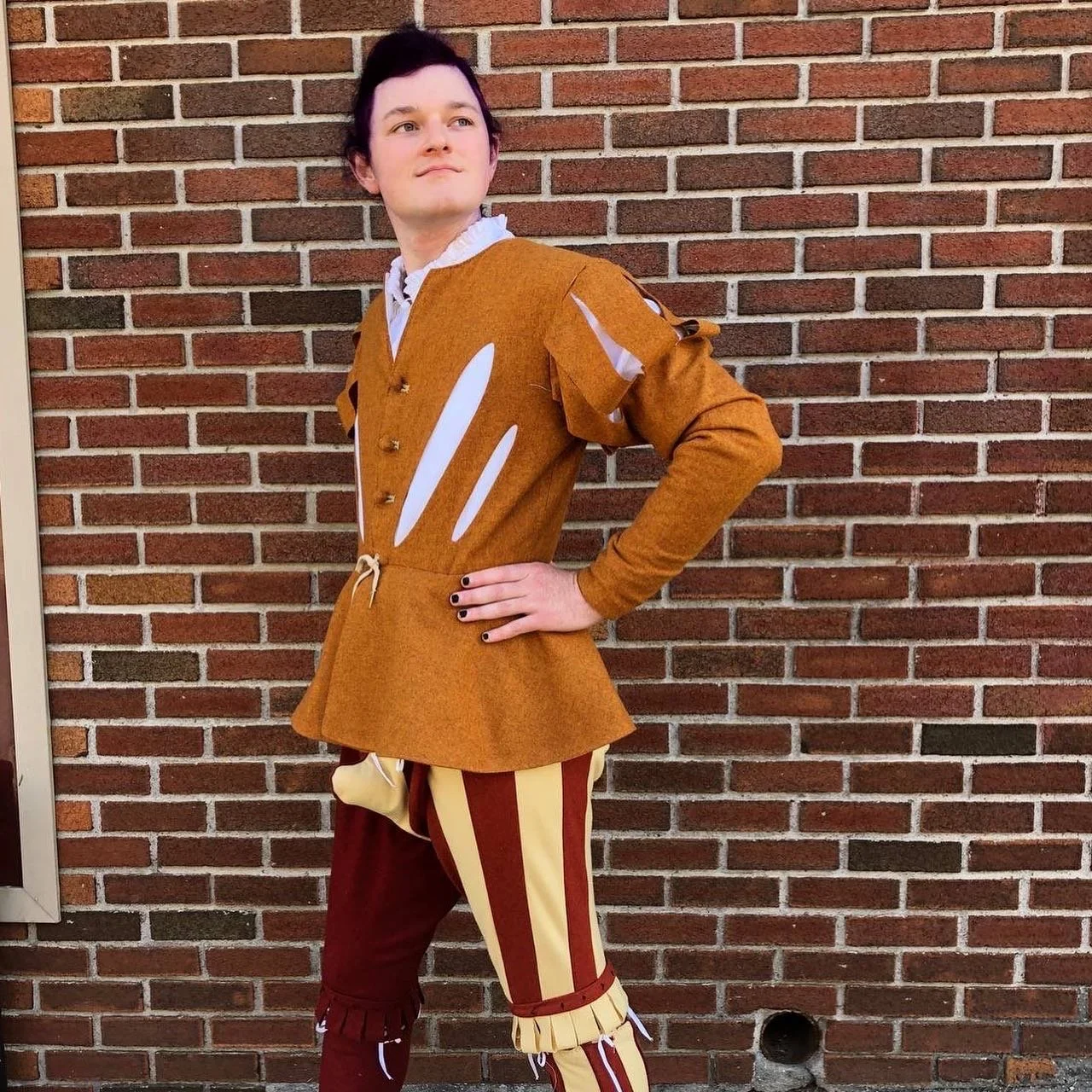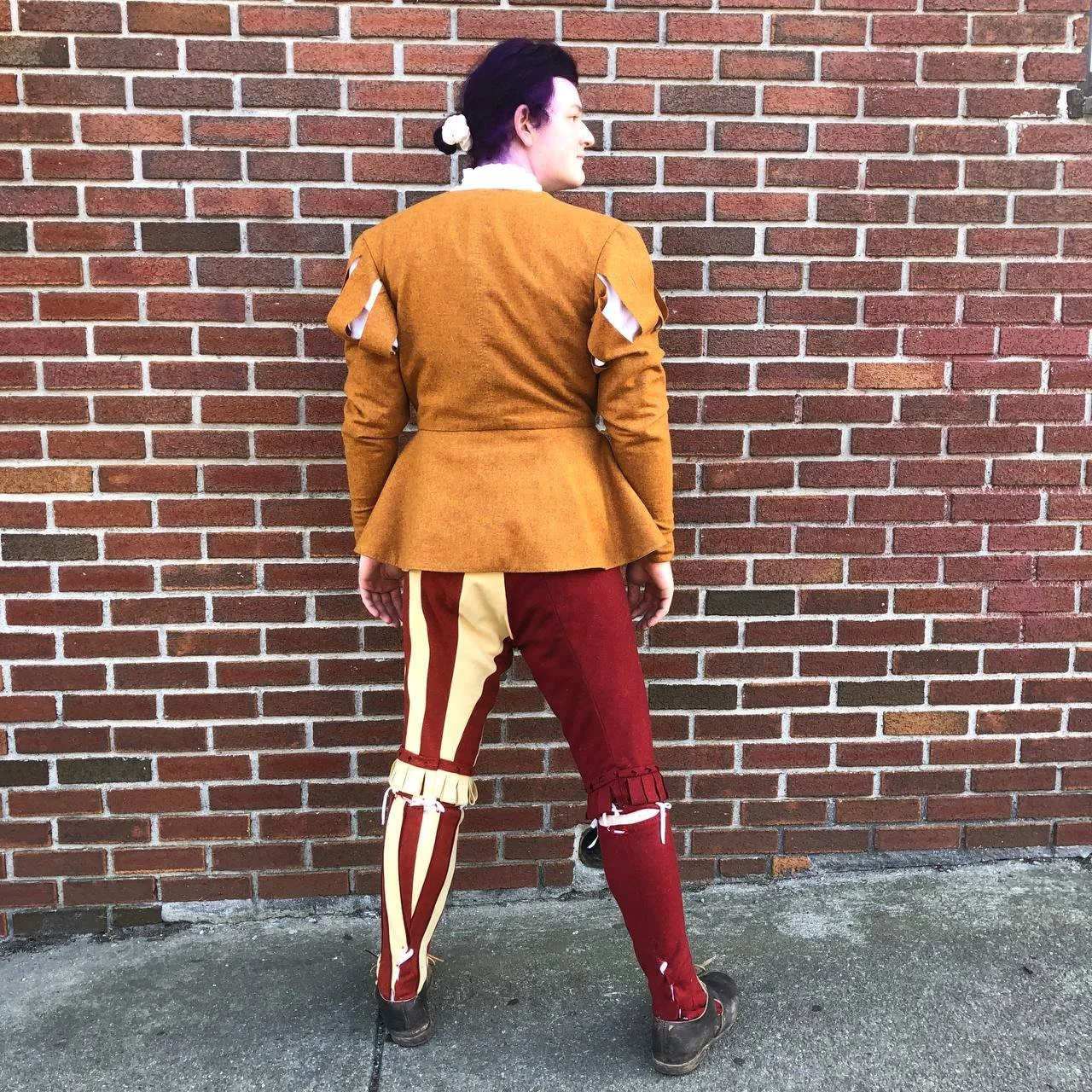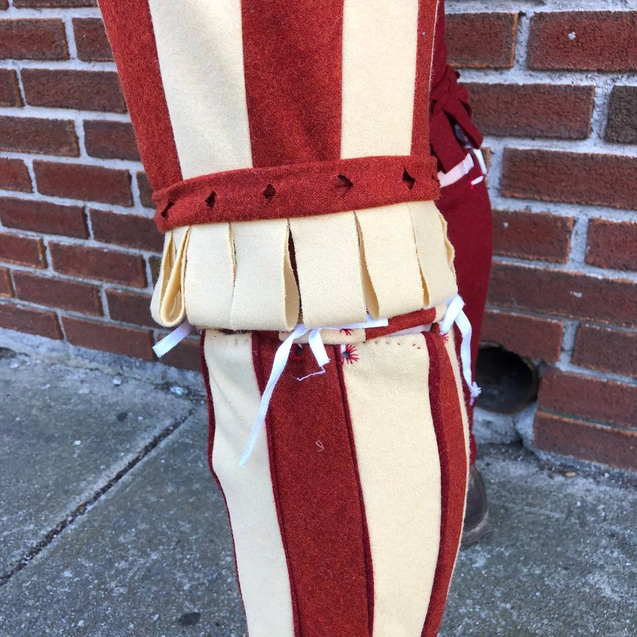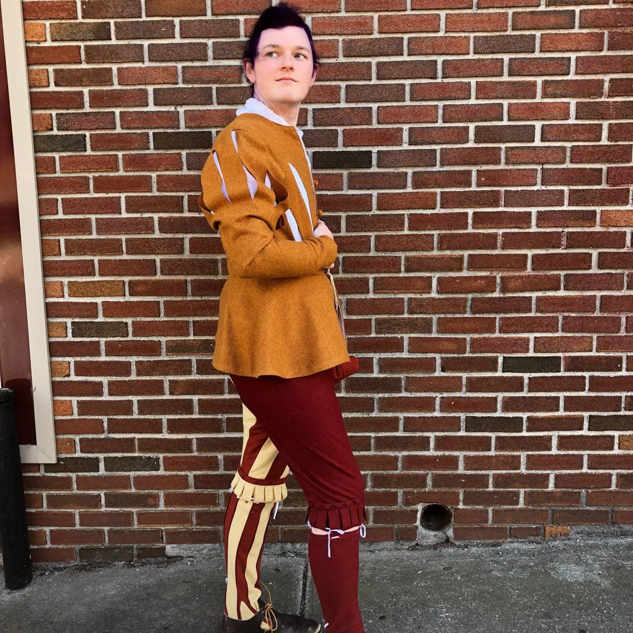 The suit is a fascinating mix of older and newer 16th century fashions. Tight hosen paired with skirted wams illustrates the changing silhouette of the period.