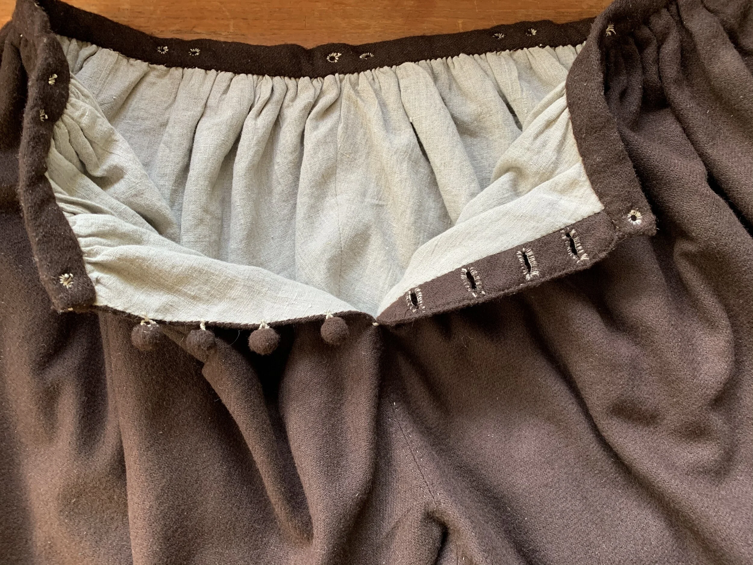 These pointed breeches know as “Venetians” in the period are based off of examples from the mid 16th to the early 17th century. Found on English, dutch, and other sailors, these trousers are a unique fashion of mariners. Made of Medium weight wool lined with unbleached linen.