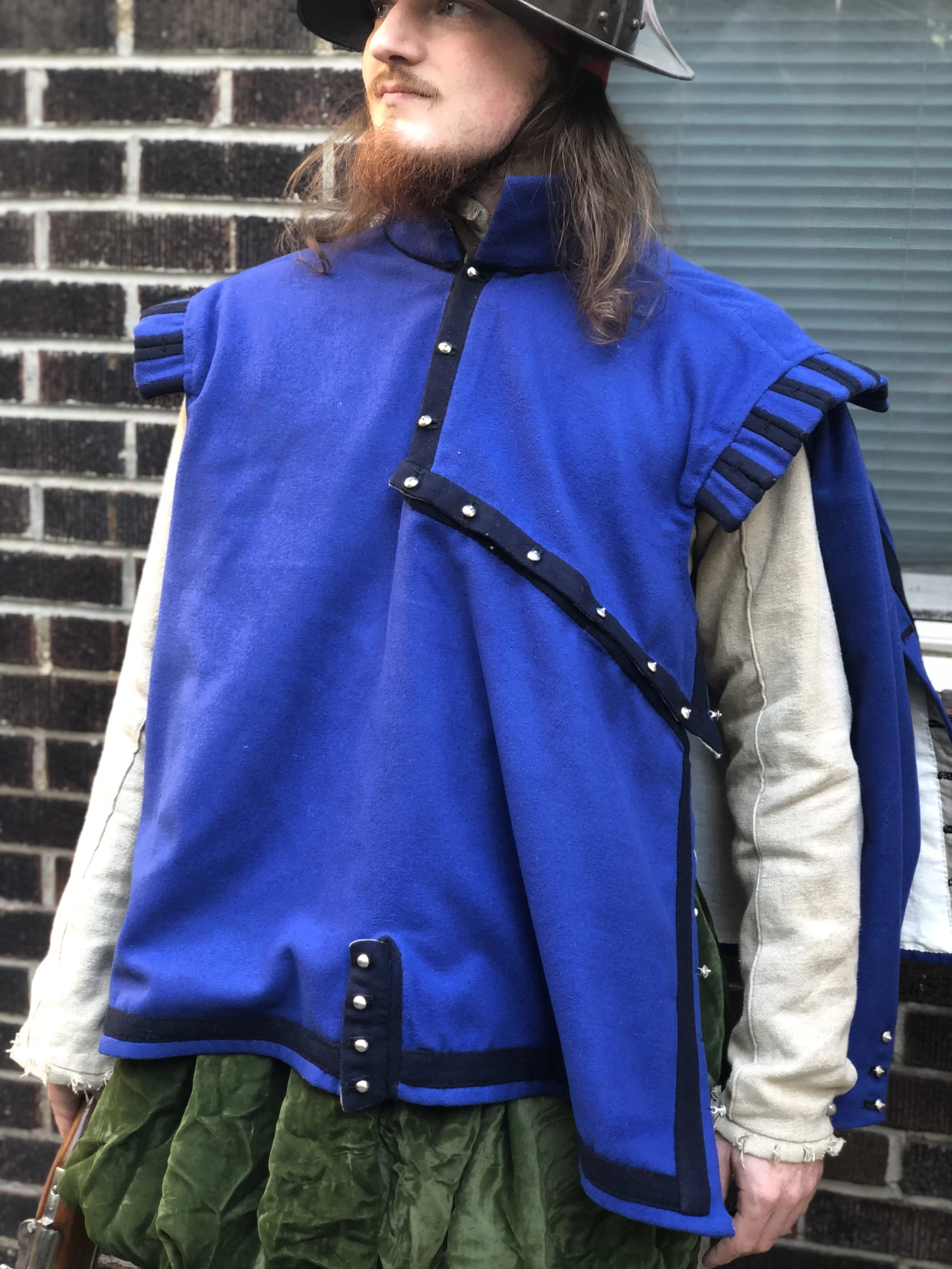The collar and sleeves sport welts in a contrasting fabric. This is seen in art and extant garments from the 17th century.