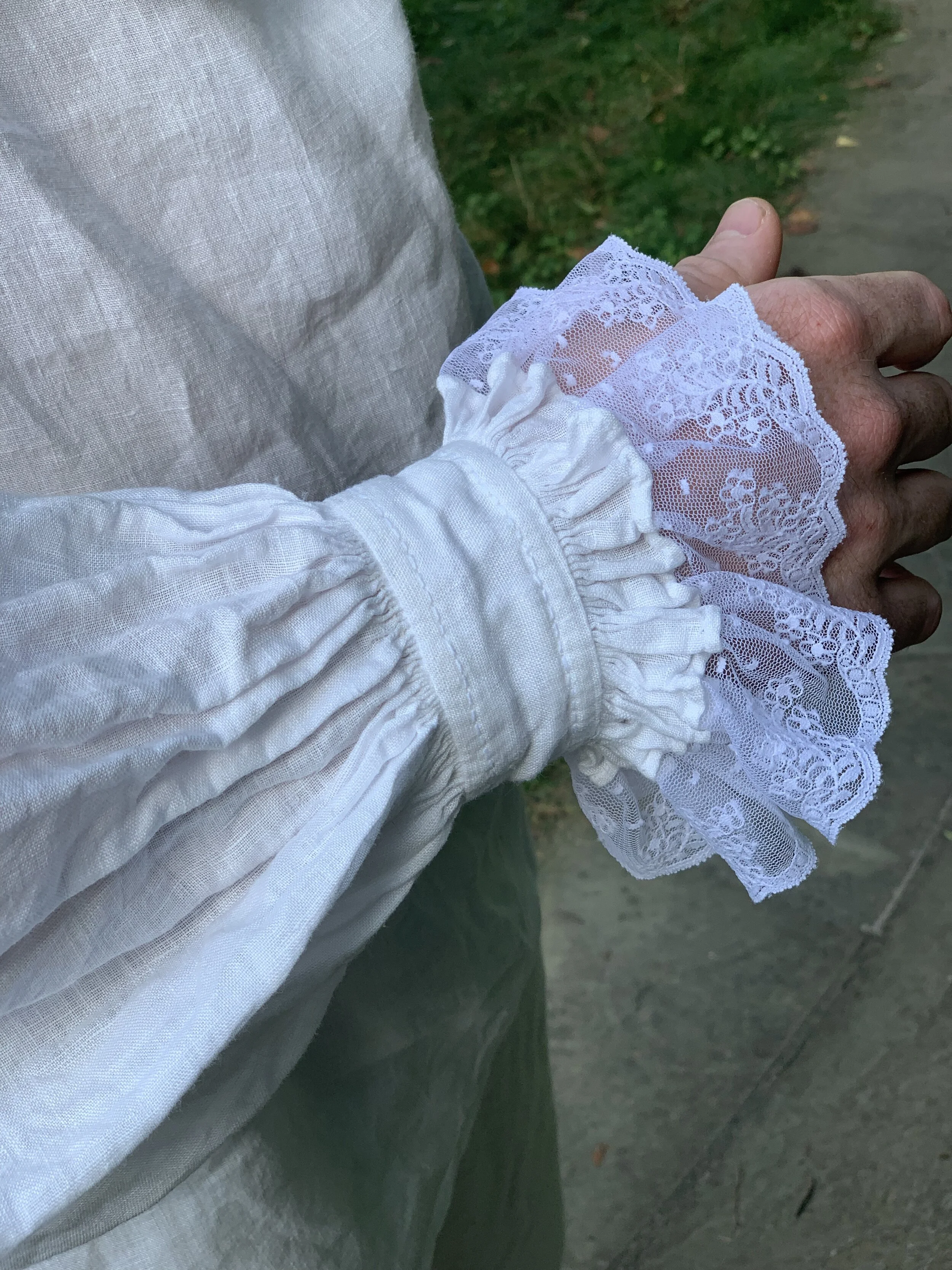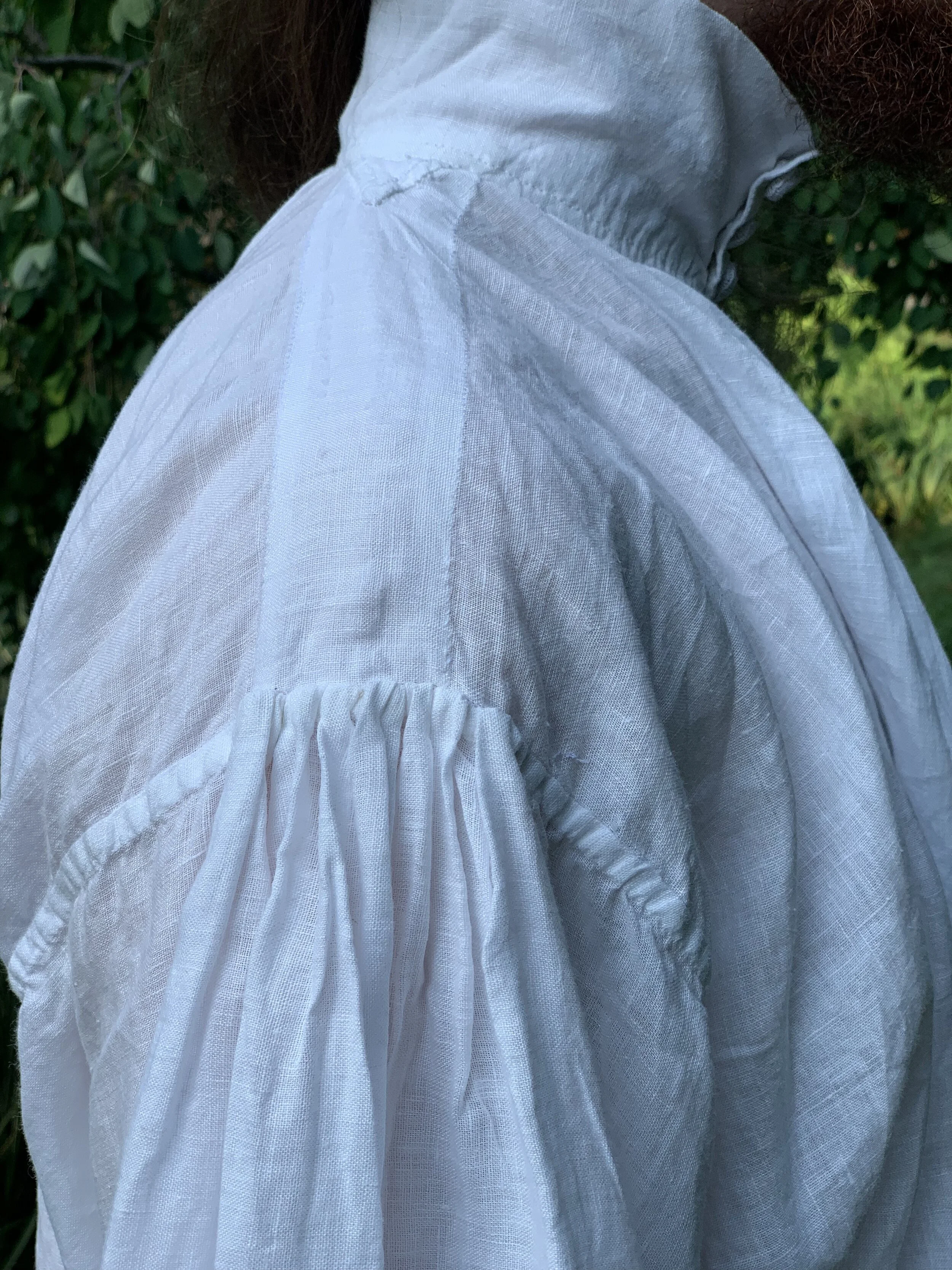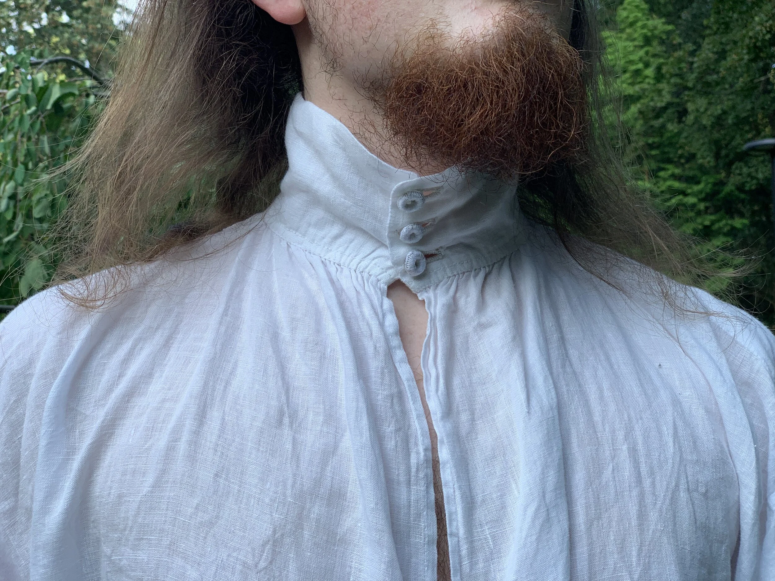 Based mostly off an extant shirt from the Victoria Albert museum, the shirt fastens with cuff links and three buttons on the collar. It also features a spiders web reinforcement found on a 1659 shirt from patterns of fashion 4.
