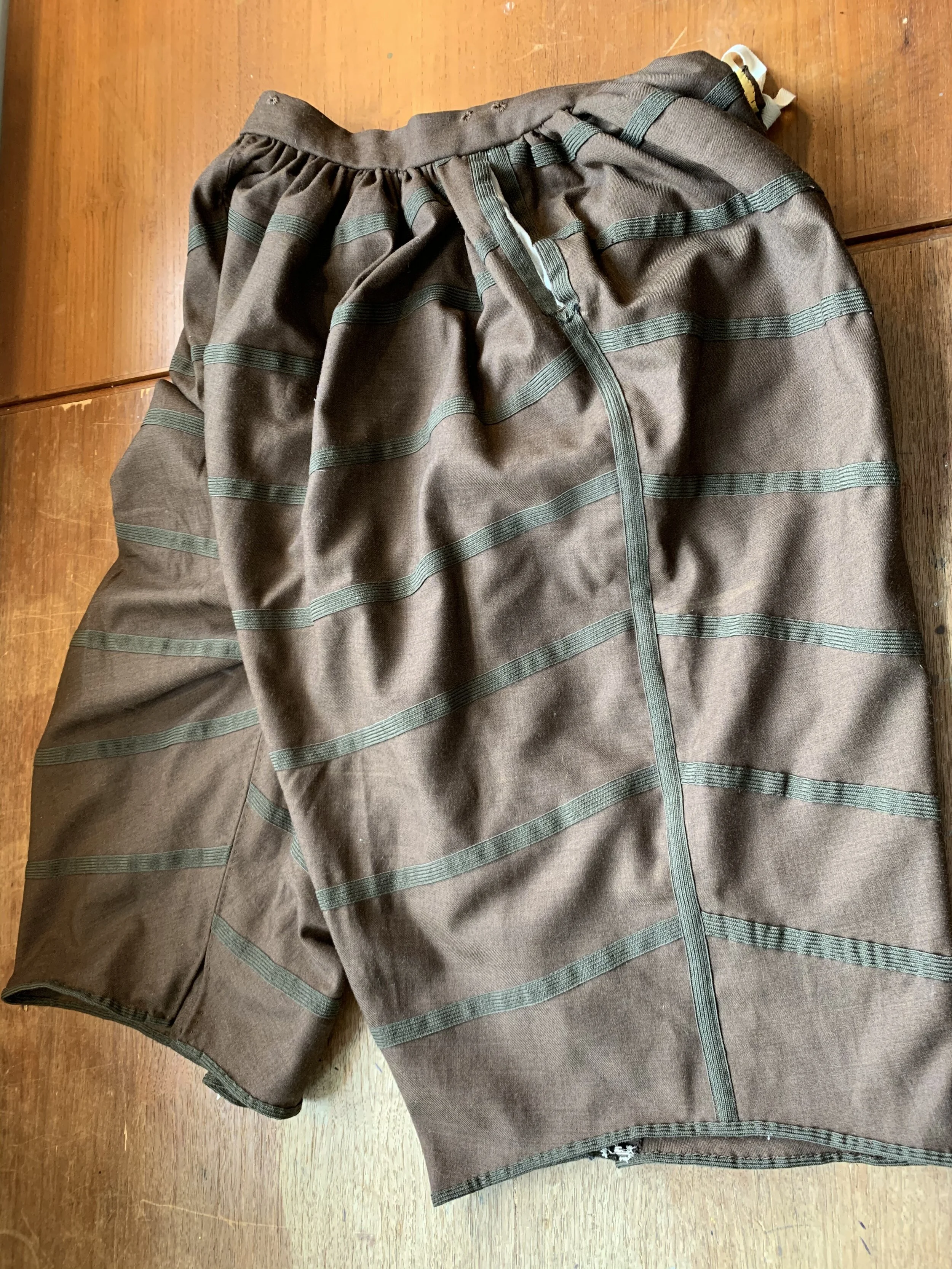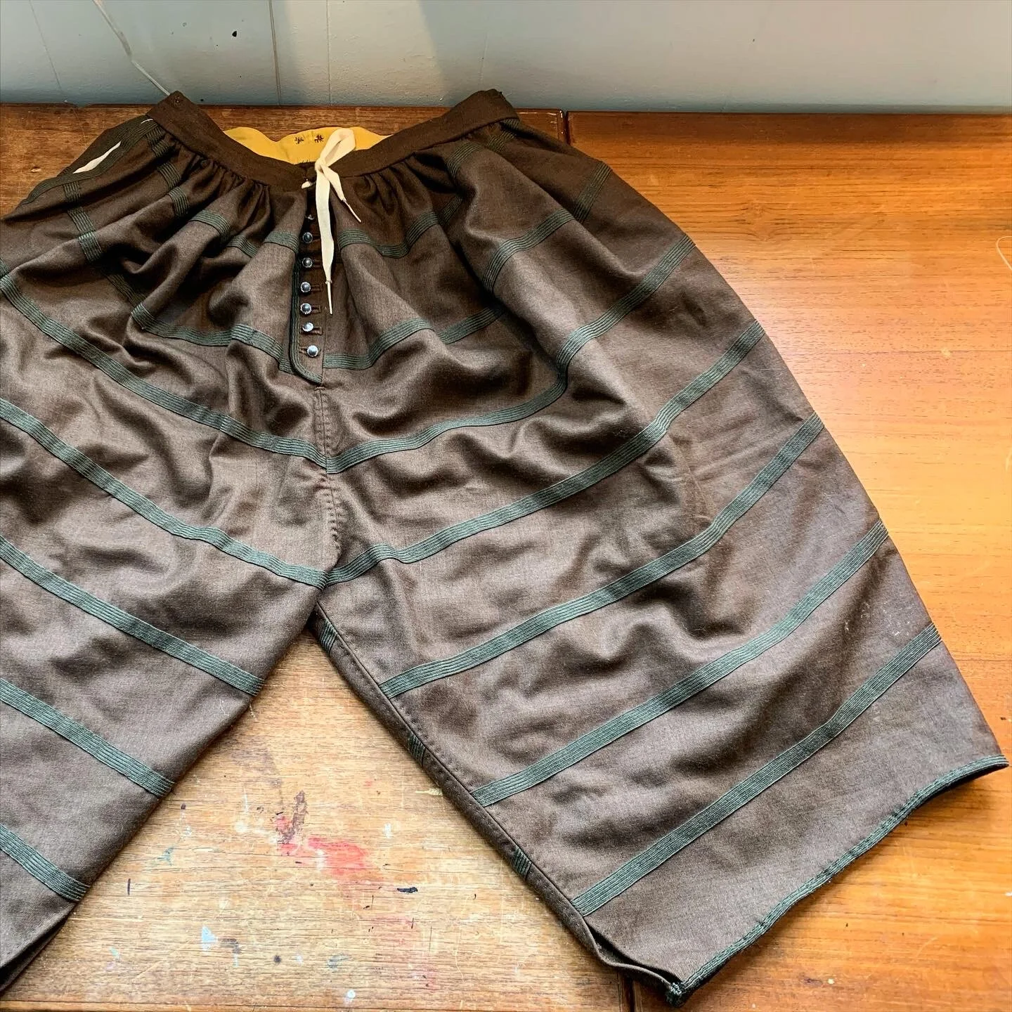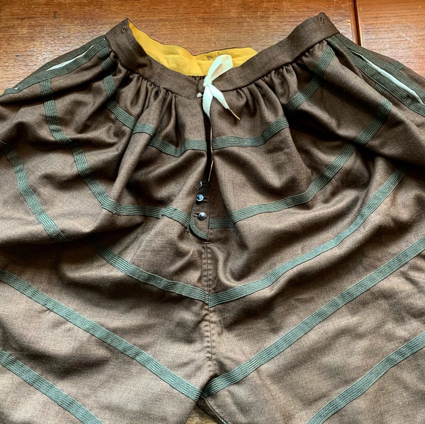 Made of worsted wool these hose are unlined and faced with a goldenrod linen. Partially machine sewn the details such as pick stitching and buttonholes are worked in silk thread. The trim is wool deadstock tape from around the turn of the century.