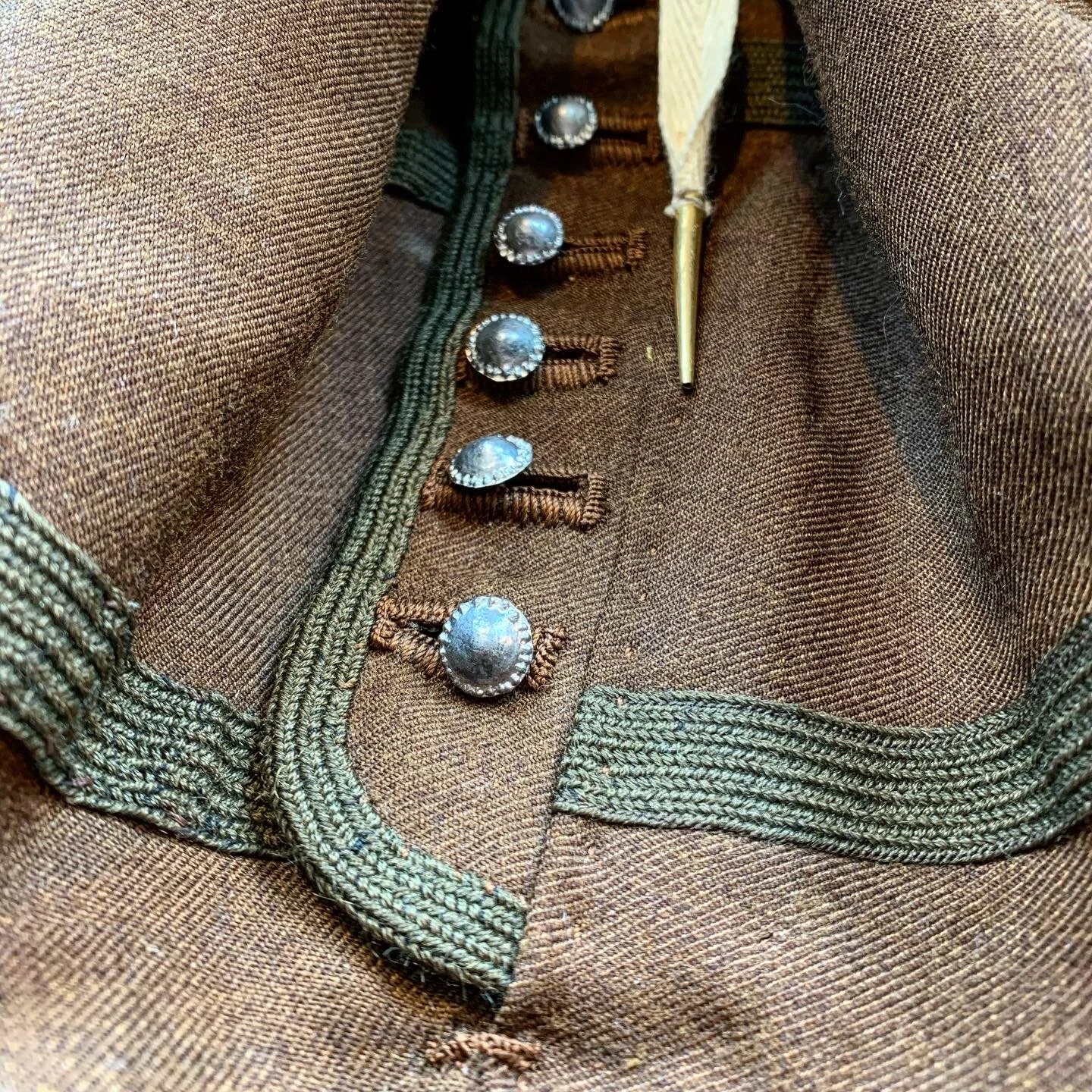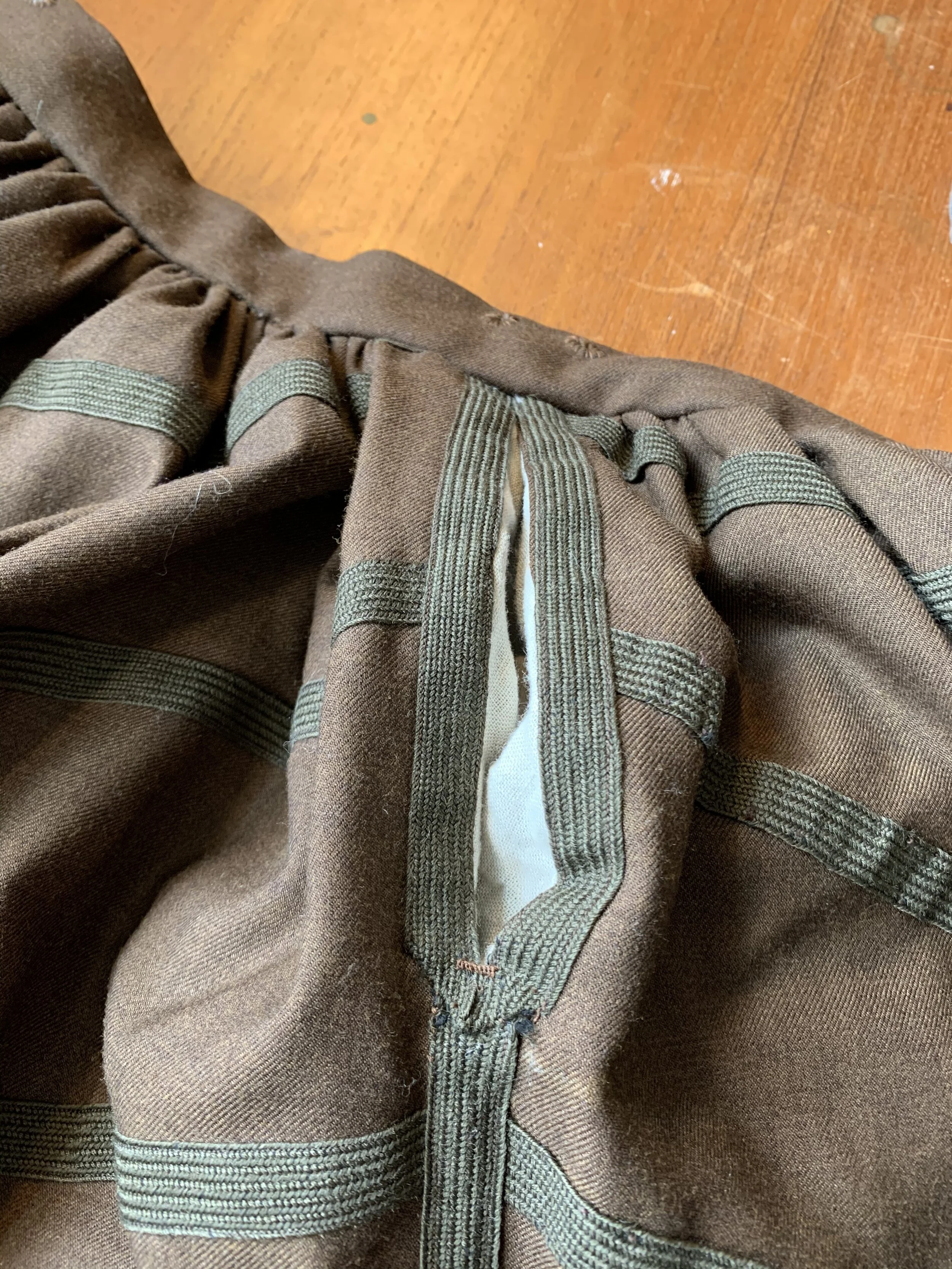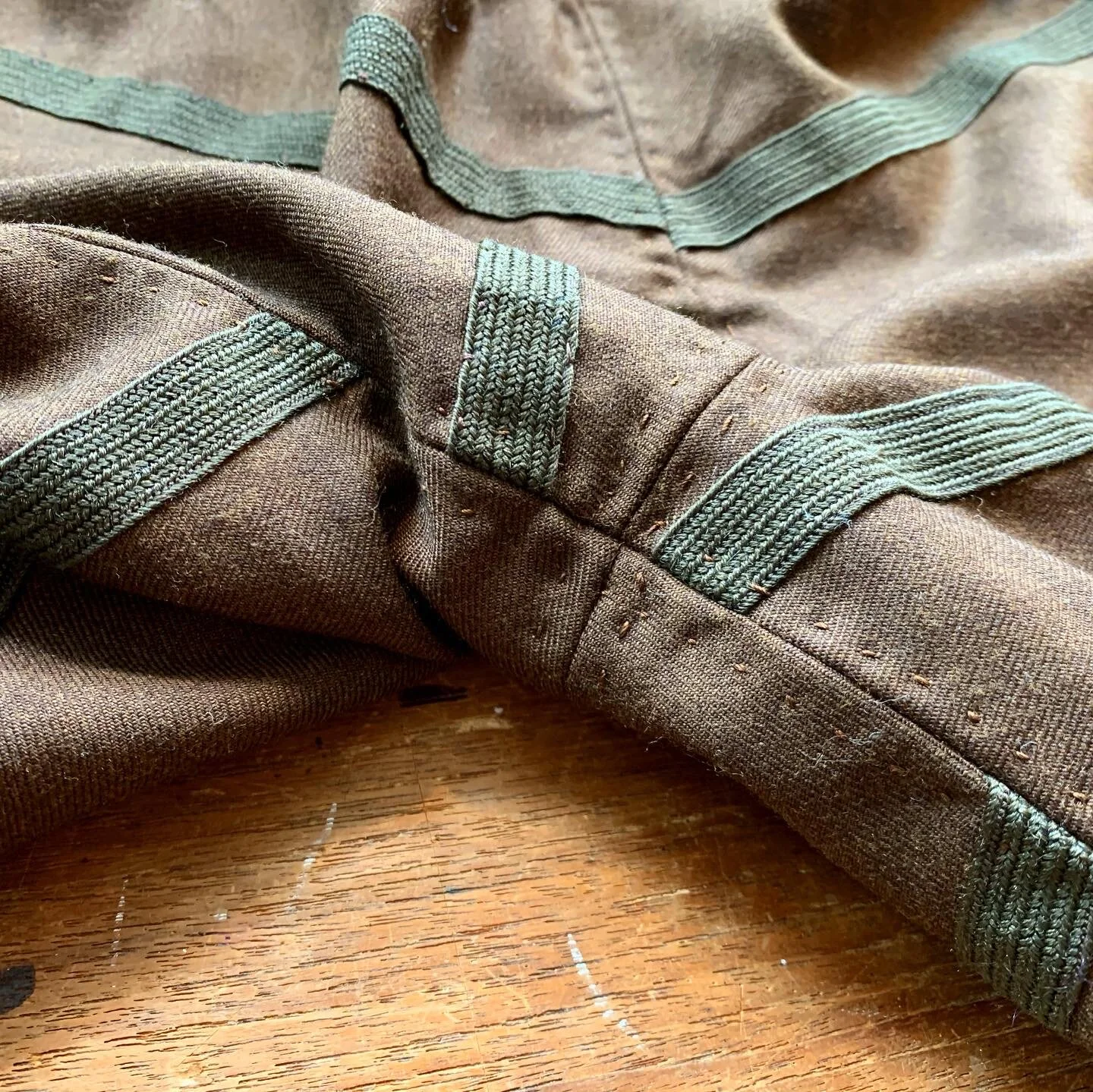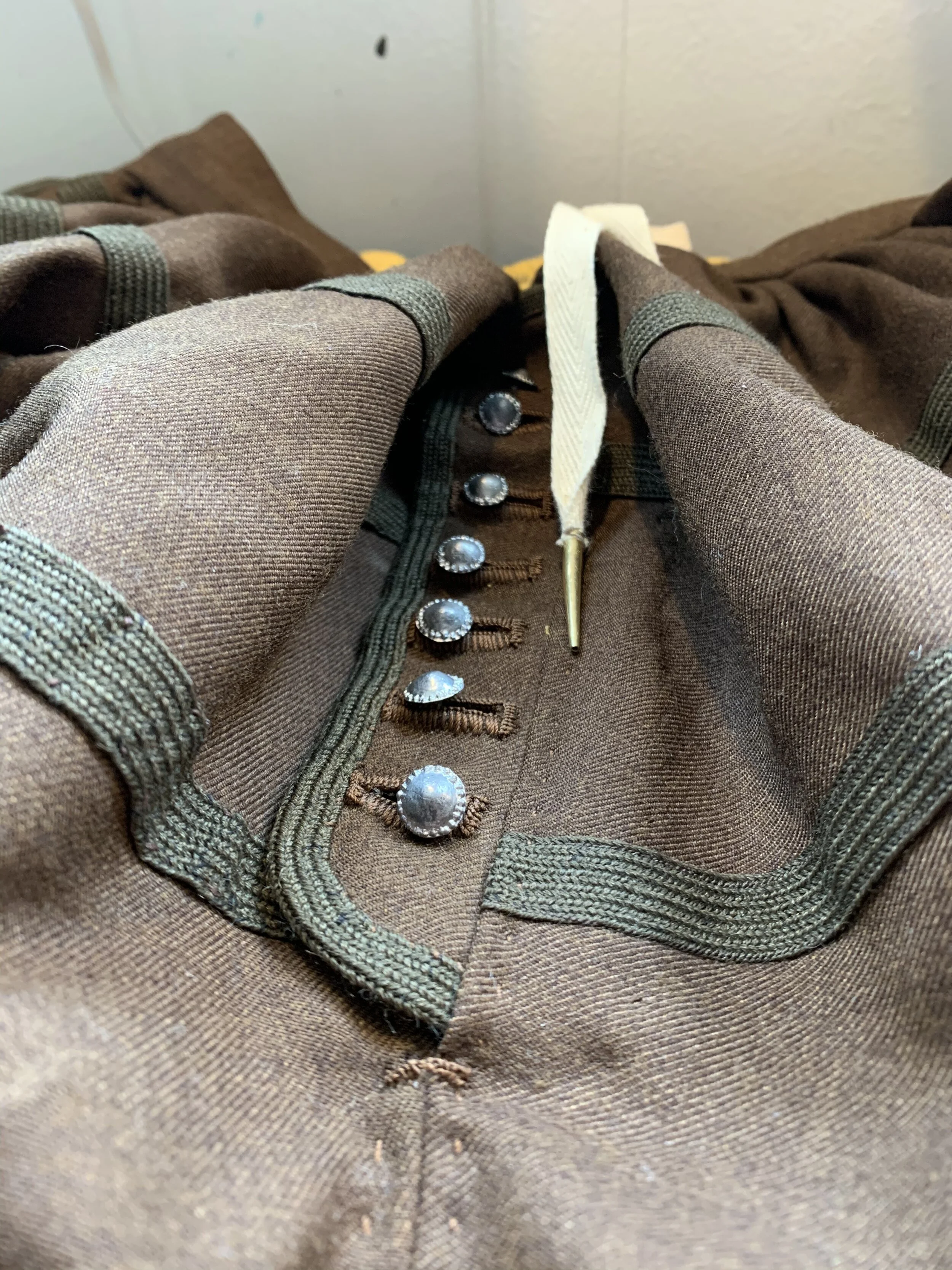 Made of worsted wool these hose are unlined and faced with a goldenrod linen. Partially machine sewn the details such as pick stitching and buttonholes are worked in silk thread. The trim is wool deadstock tape from around the turn of the century.