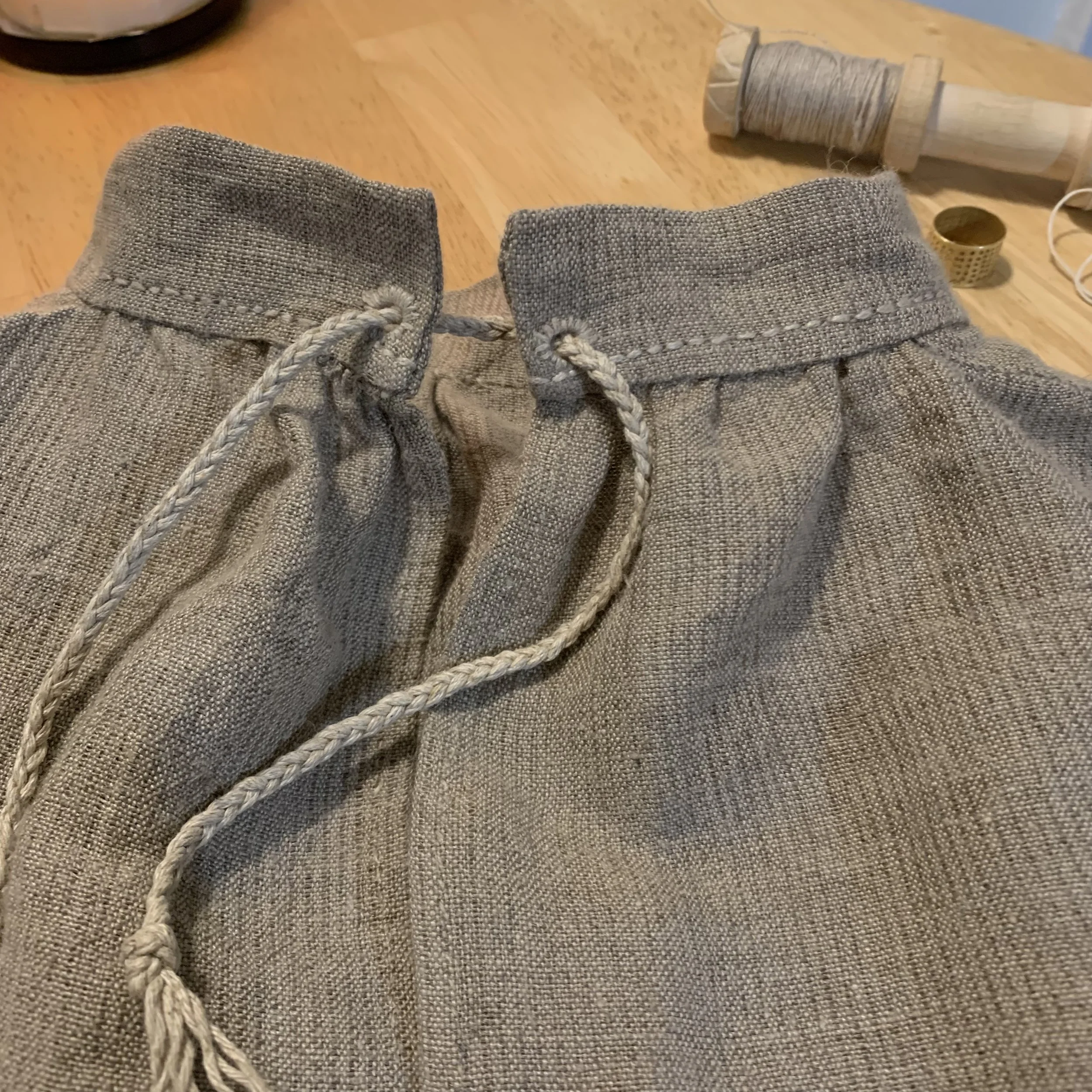 The shirt is made of a 6oz 29” wide linen. The width of the fabric allows the side seams to be sewn selvedge to selvedge, a technique used on original examples.