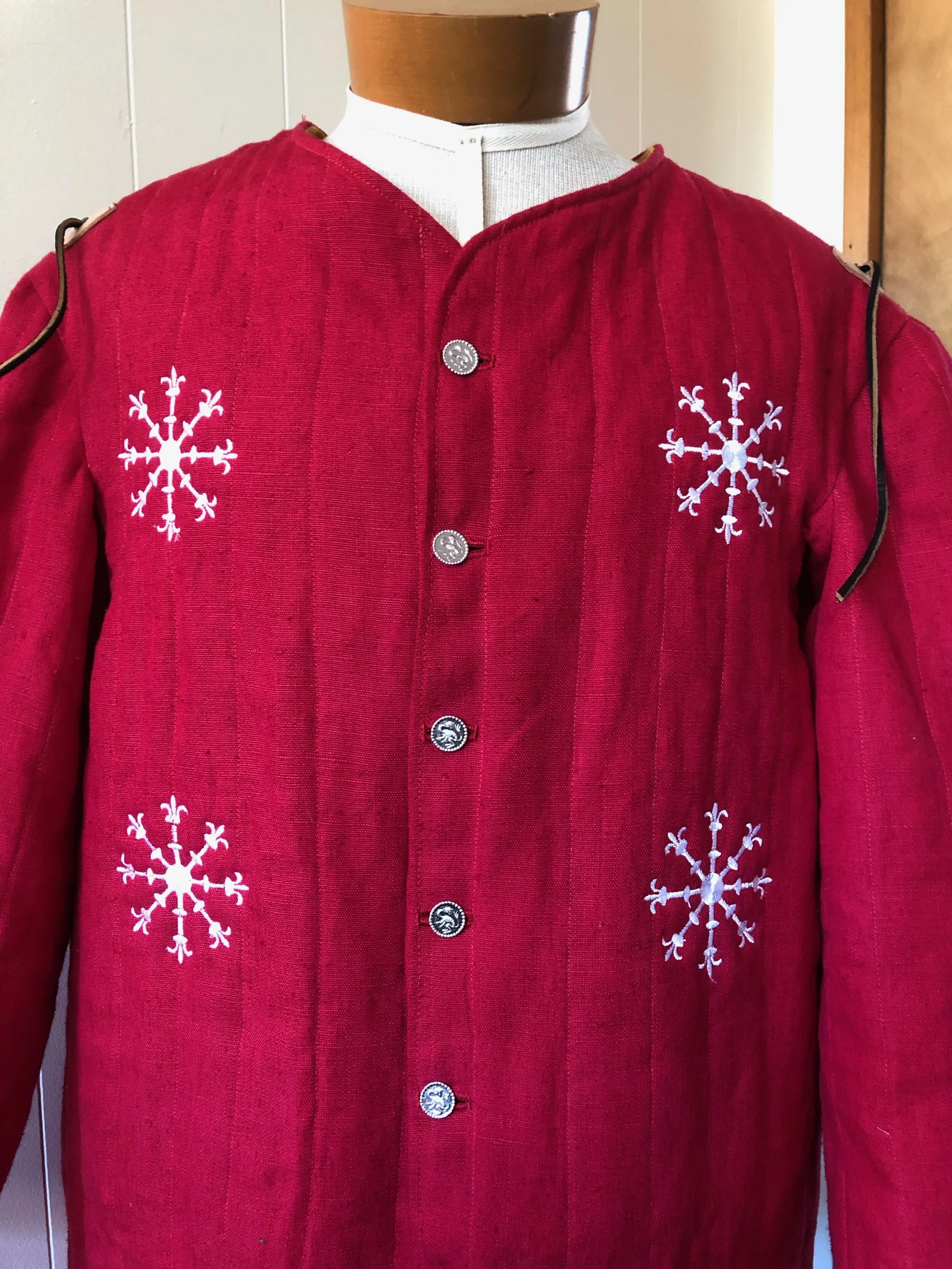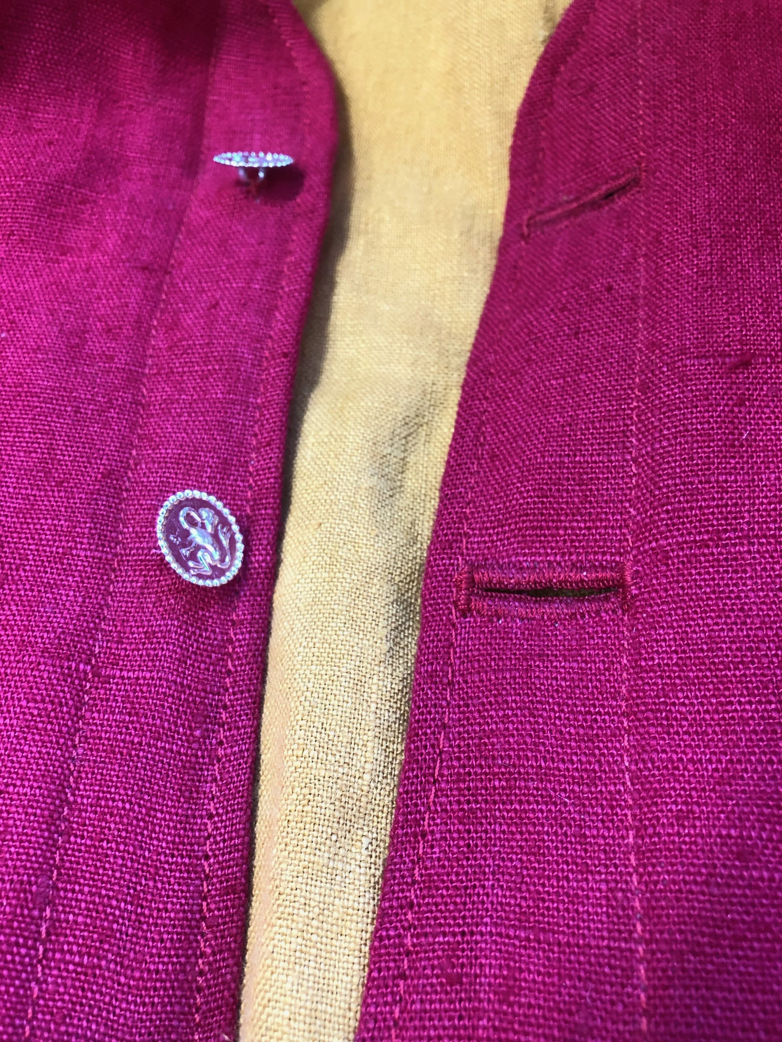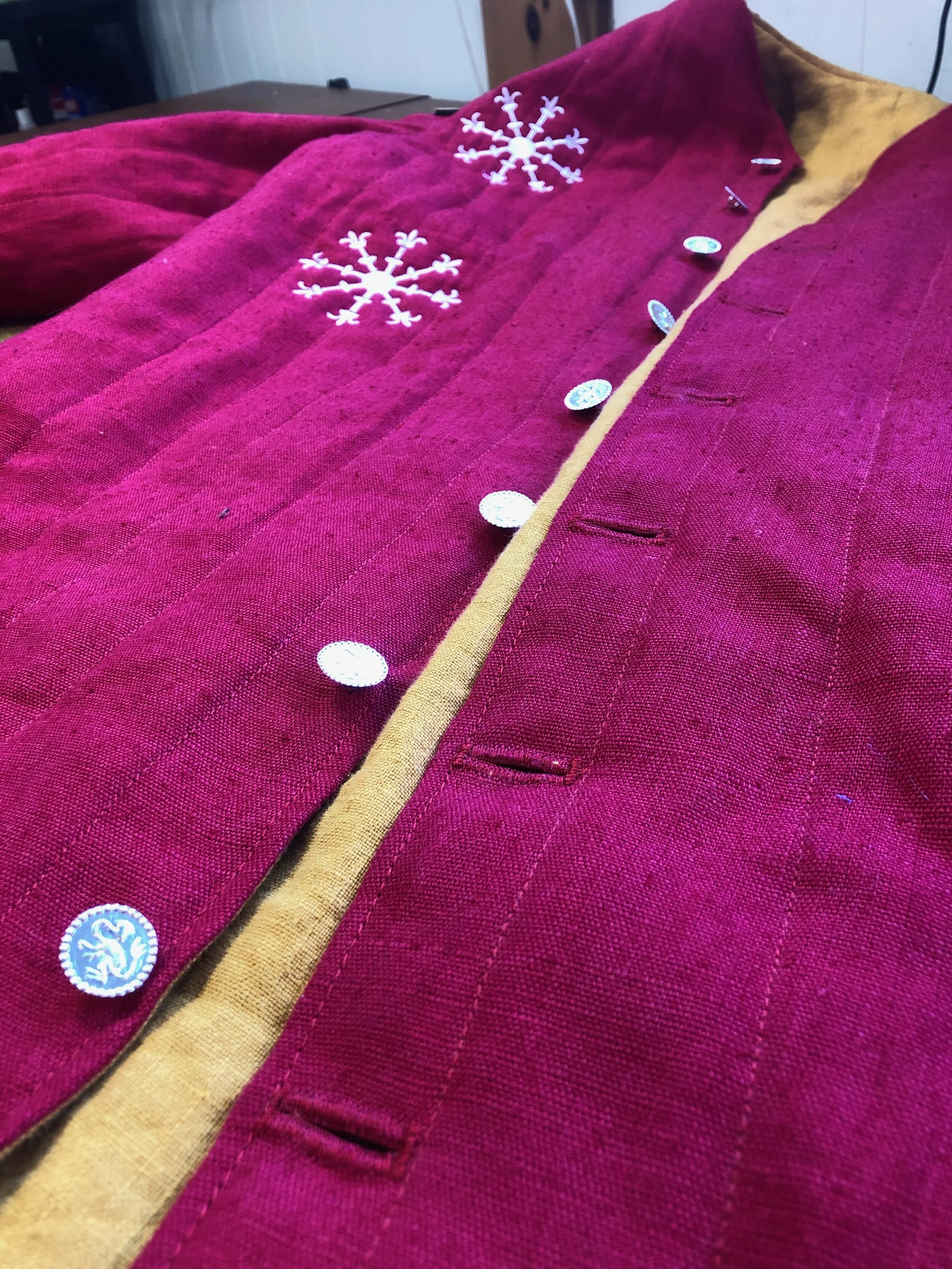 gambeson for SCA combatIt’s made with hemp lined with linen, featuring handworked buttonholes in silk.